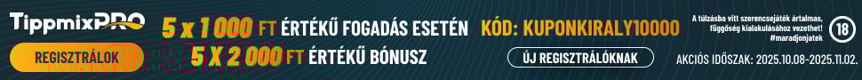 Használd az egyedi KUPONKIRALY10000 bónuszkódot, hogy megszerezhesd a bónuszod (5 x 1 000 Ft fogadás után 5 x 2 000 Ft ingyenes fogadás jár).