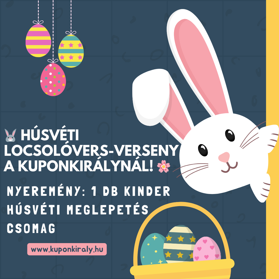 Idén a KuponKirály elhozza a digitális locsolkodást! Nem számít, hogy hölgy vagy úr, kicsi vagy nagy, nálunk mindenki versenybe szállhat a húsvéti nyereményért. Ha van egy jó locsolóversed, ne tartsd magadban: nevezz bármelyik közösségi média felületünkön, és vidd el a Kinder meglepetés csomagot!