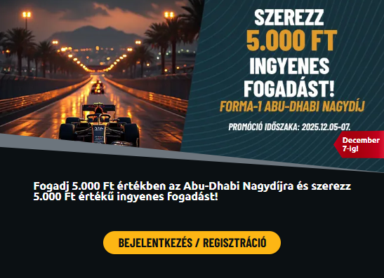 Ha 2025. december 05. 15:00 és 2025. december 06. 23:59 között legalább 5.000 Ft értékben fogadsz a Abu Dhabi Nagydíj időmérőjére, cserébe megajándékozunk egy 5.000 Ft értékű ingyenes fogadással a vasárnapi futamra!
