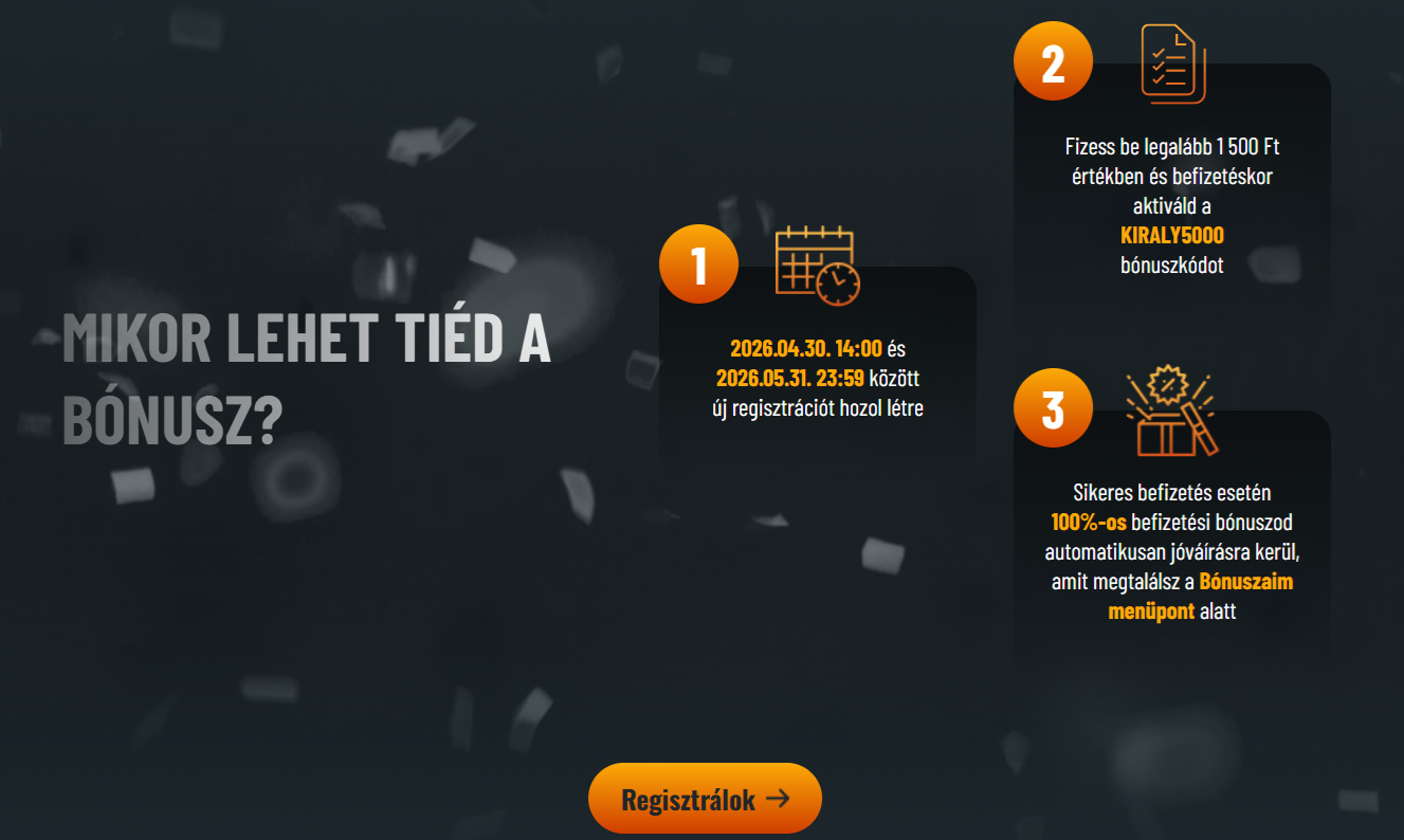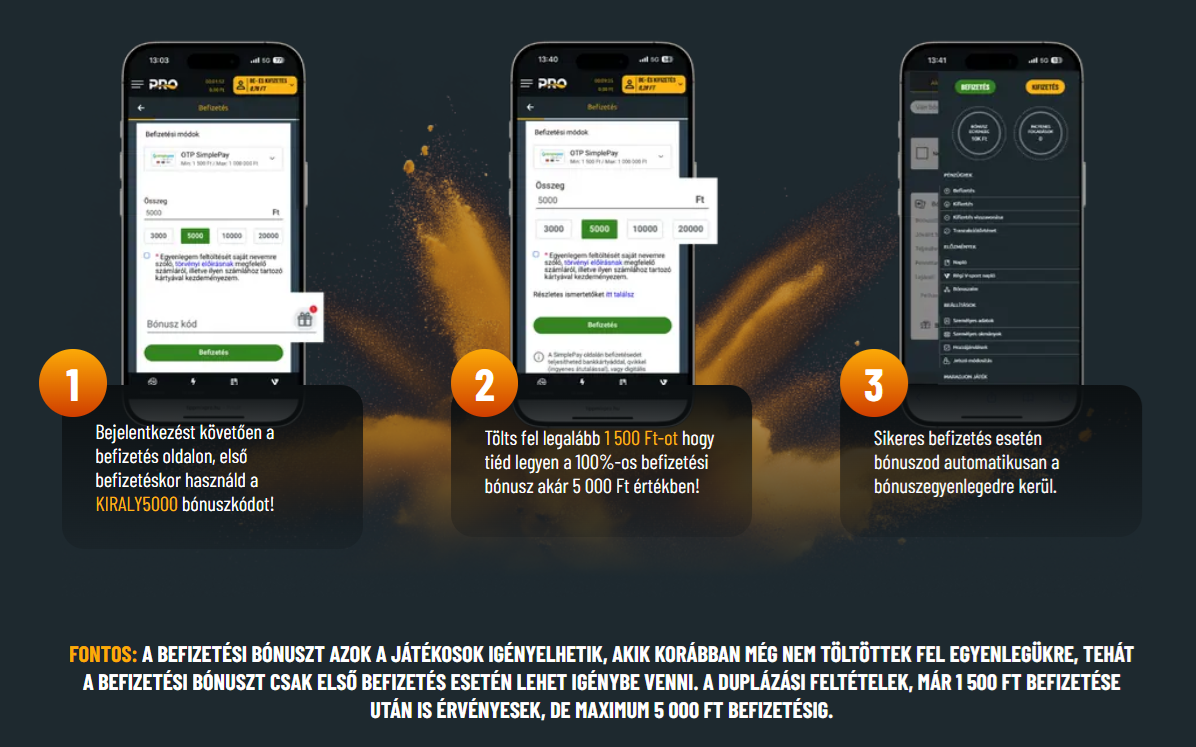 Aktiváld a kódot: Az első befizetésed elindításakor használd a KIRALY5000 egyedi bónuszkódot.